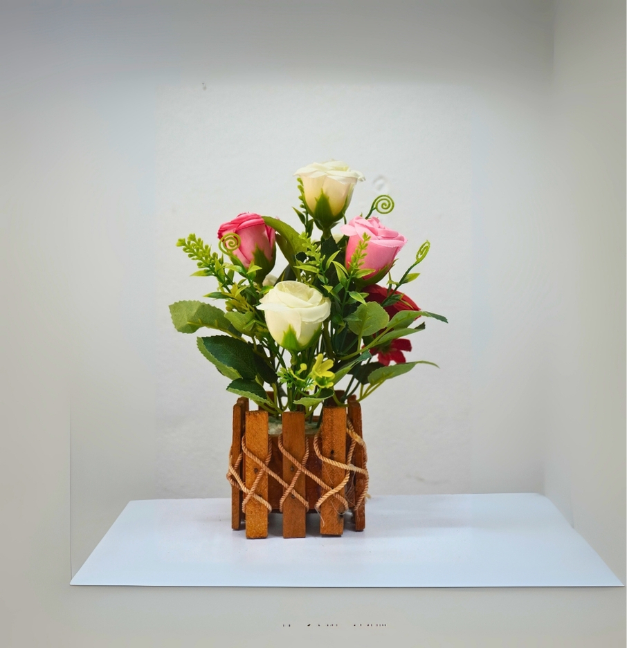 কাঠের টবে গোলাপ – 14 ইঞ্চি সাদা ও গোলাপি ফুল