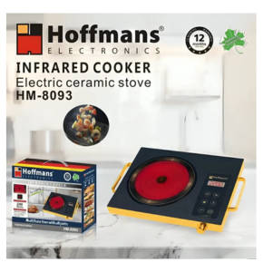 The Hoffmans HM-8093 Infrared Cooker is a versatile and modern cooking solution for any kitchen. Designed with a sleek glass plate cooktop, it works with all types of stainless steel and flat-base cookware—no special induction plate required. With a powerful 2200W heating capacity and adjustable power range from 100W to 2200W, it ensures fast, energy-efficient cooking. The smart touch sensor panel and digital controls make it easy to operate, allowing precise temperature adjustments similar to a gas stove.